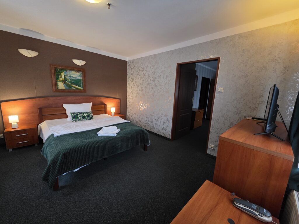 Pokój powita Cię oddzielną sypialnią z wygodnym łóżkiem queen 140 x 200 cm, zaopatrzoną w wysokiej jakości materac, świeżą pachnąca pościel, oraz miękkie poduszki.